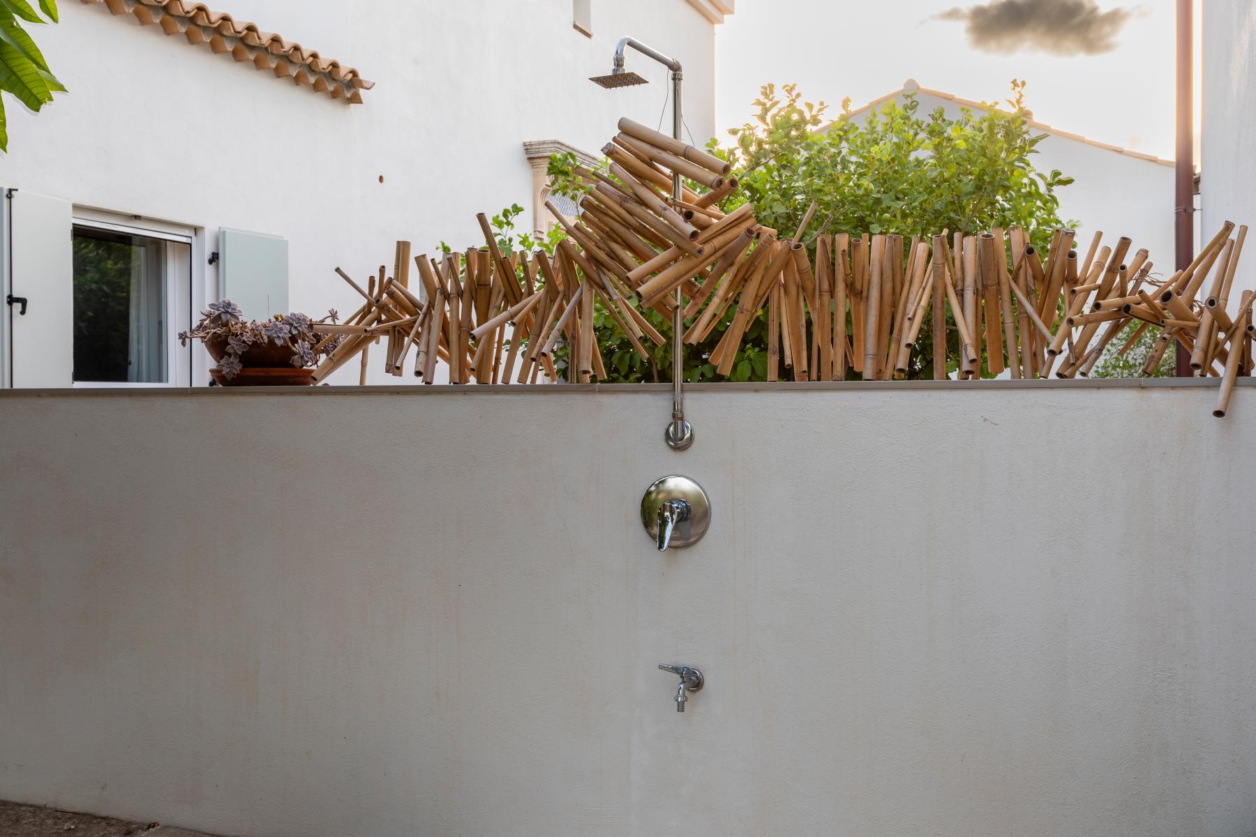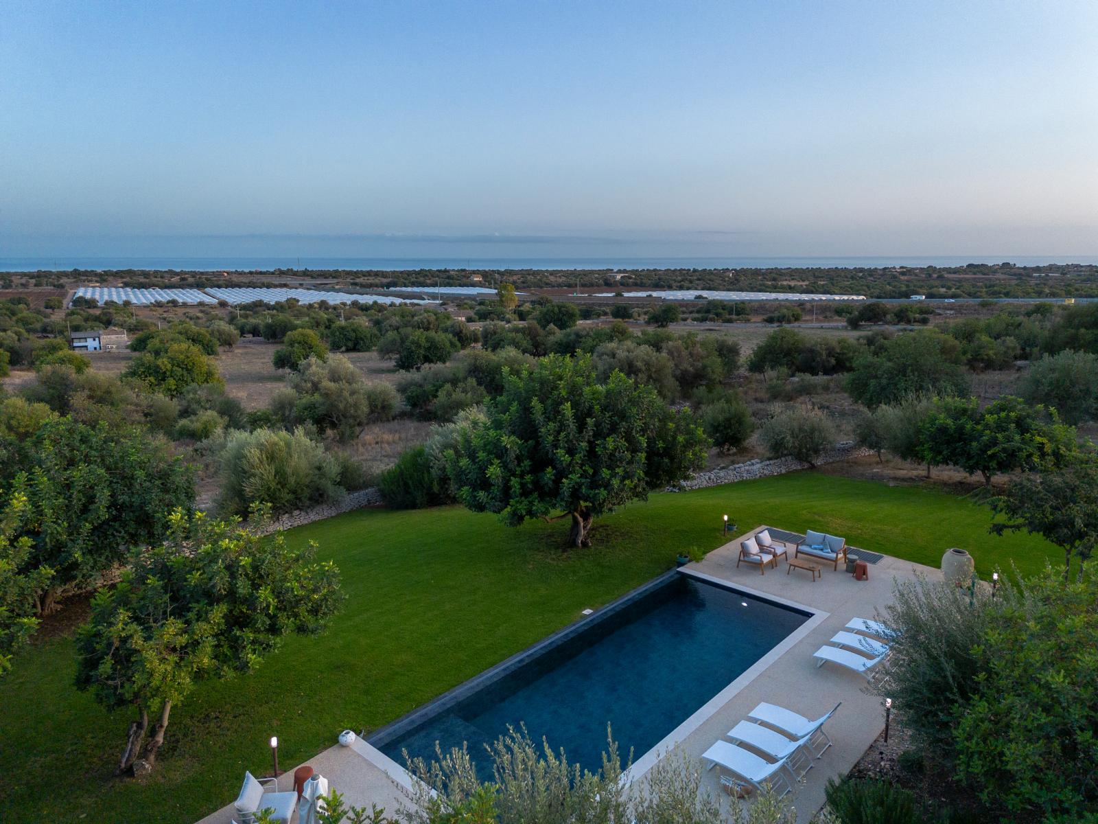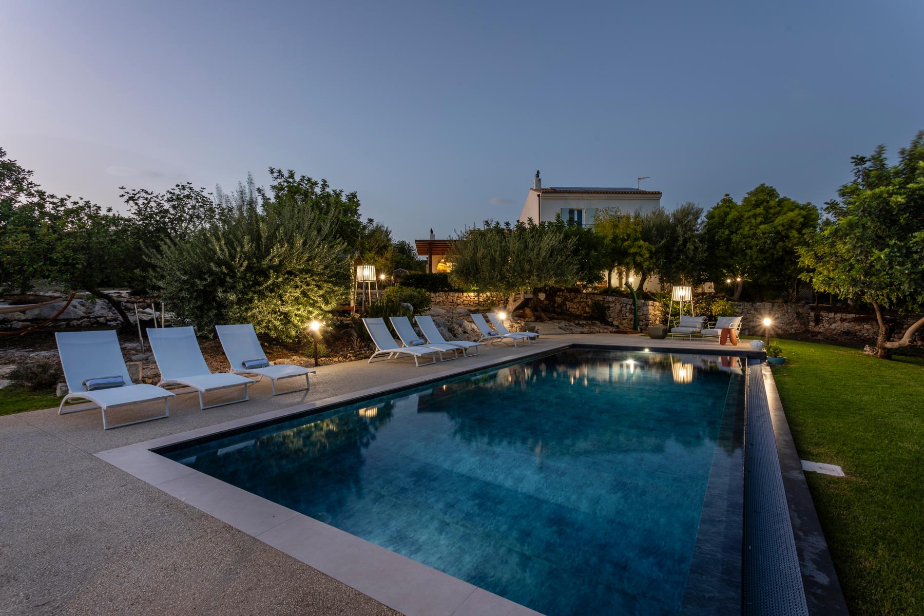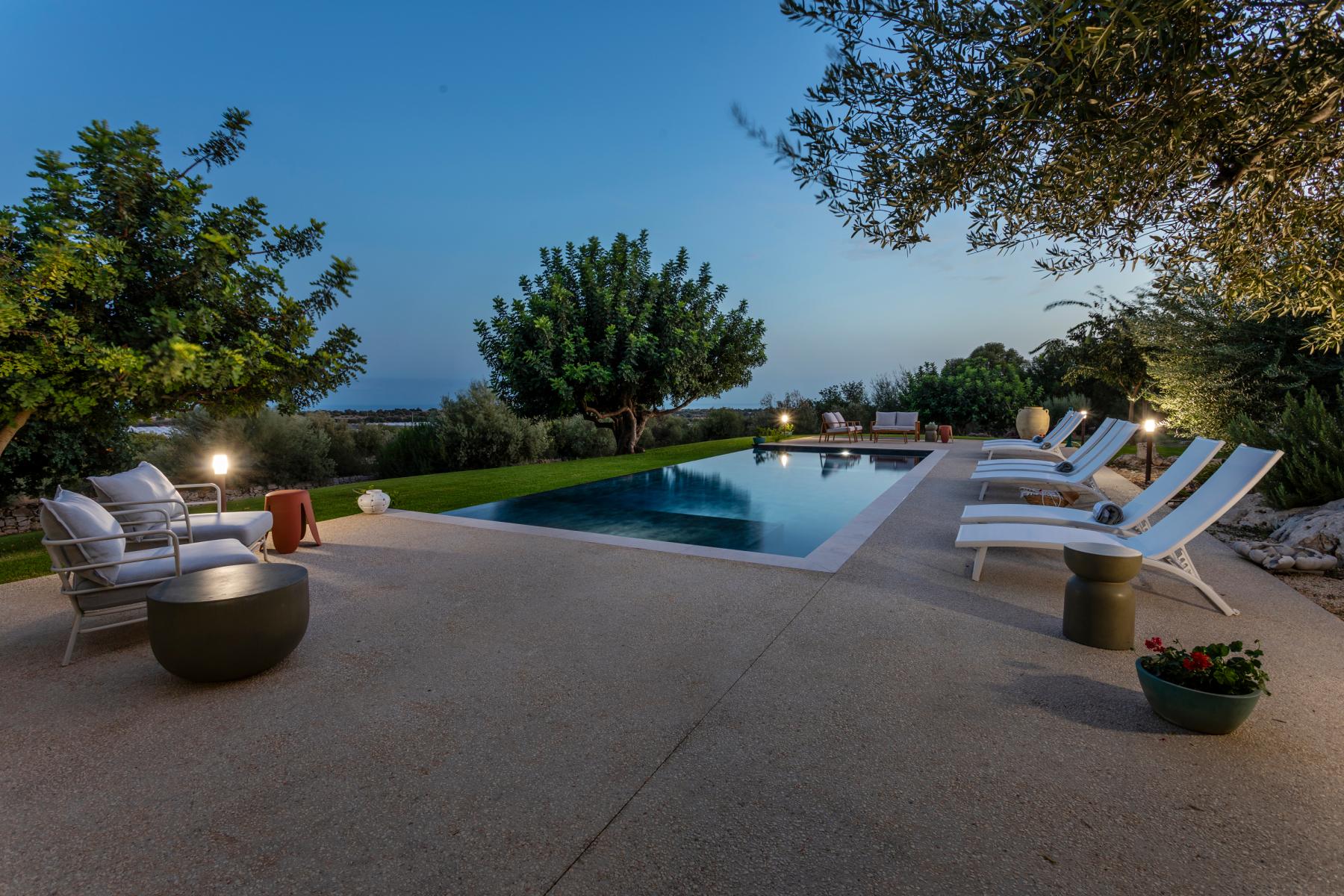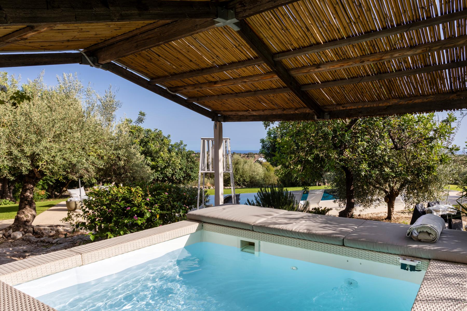 La villa si affaccia su un incantevole giardino con una splendida piscina, una jacuzzi e alberi di ulivo e agrumi. L'esterno è arredato con lettini prendisole e ombrelloni, mentre una zona pranzo esterna, direttamente collegata alla cucina, offre viste sul giardino, sulla piscina e sul mare in lontananza.