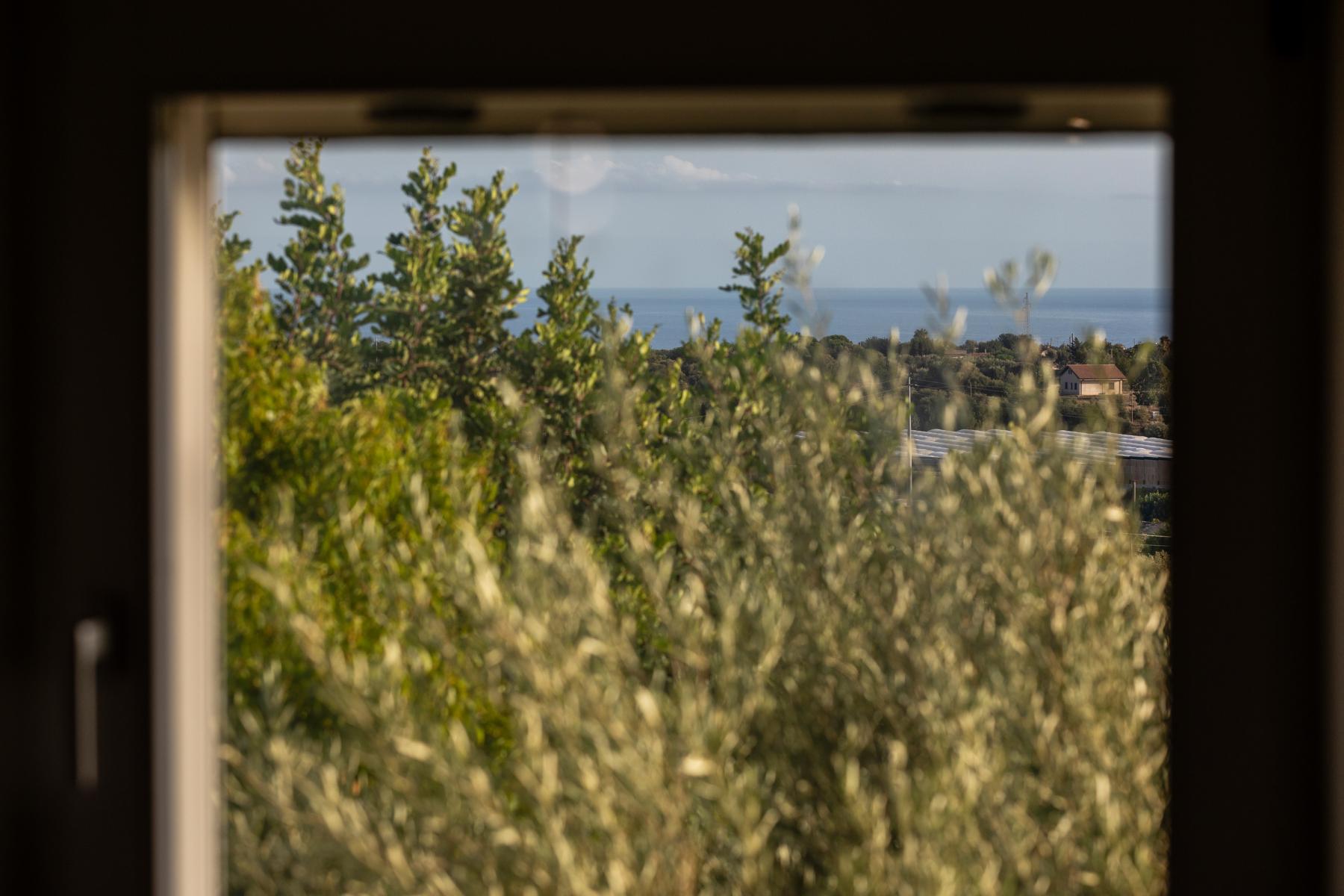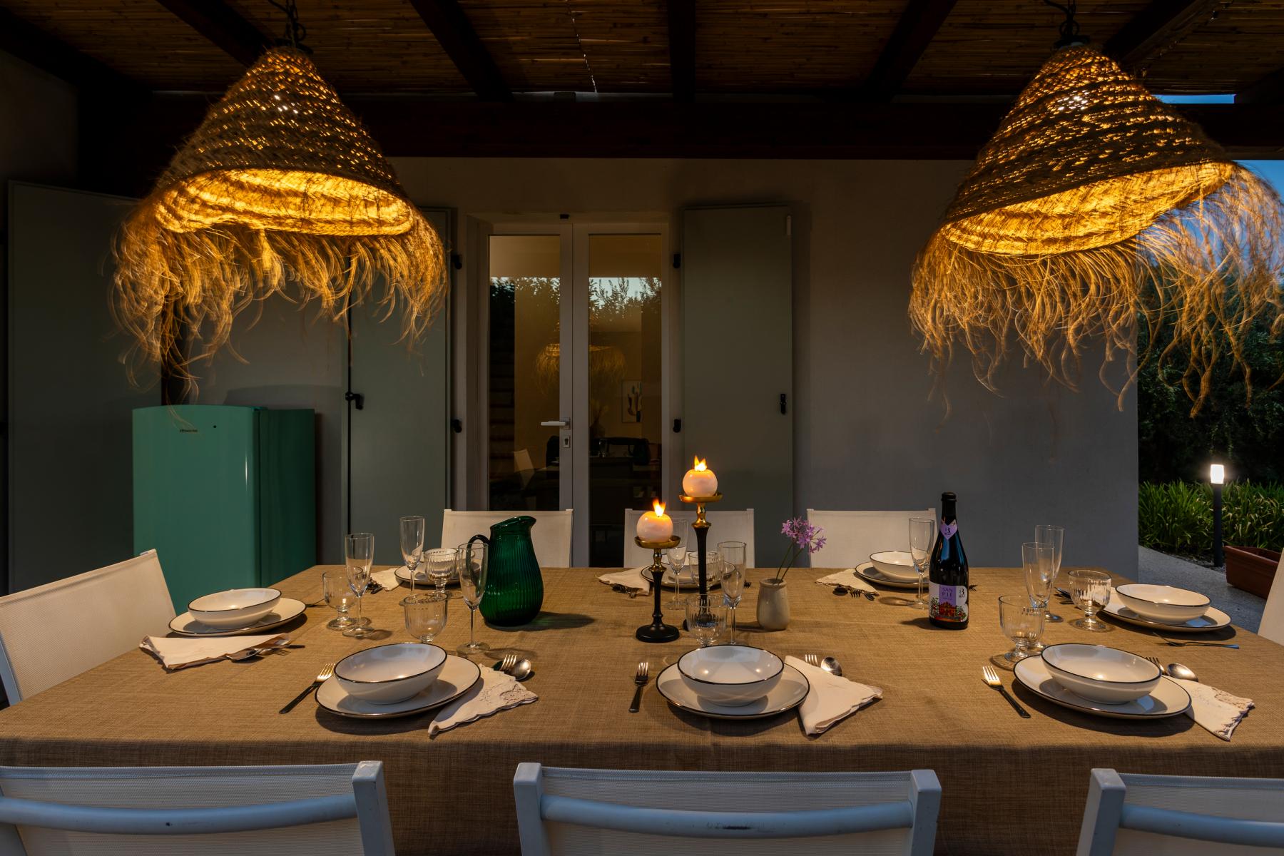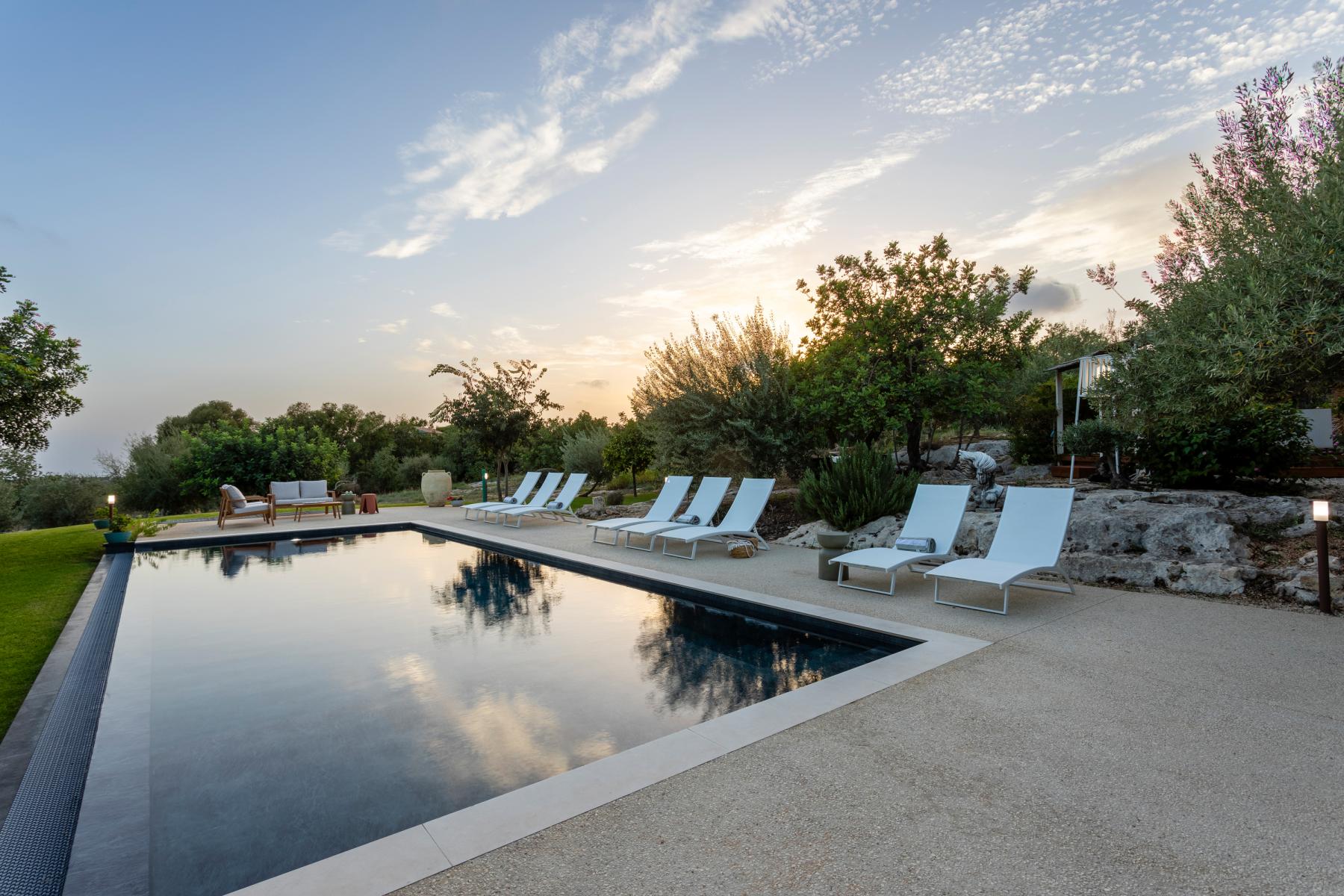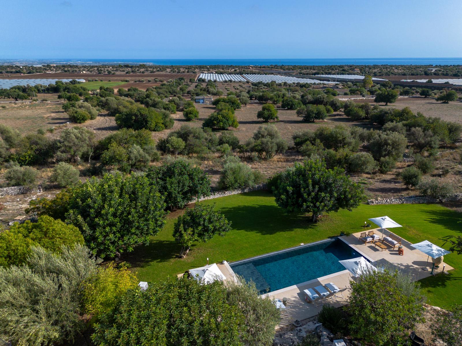 La villa si affaccia su un incantevole giardino con una splendida piscina, una jacuzzi e alberi di ulivo e agrumi. L'esterno è arredato con lettini prendisole e ombrelloni, mentre una zona pranzo esterna, direttamente collegata alla cucina, offre viste sul giardino, sulla piscina e sul mare in lontananza.