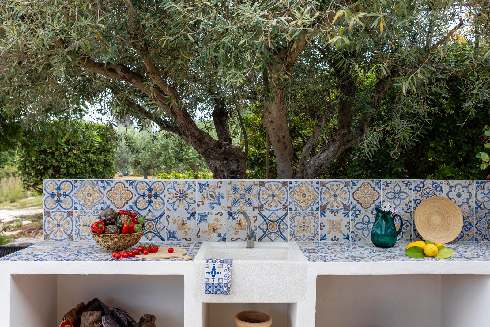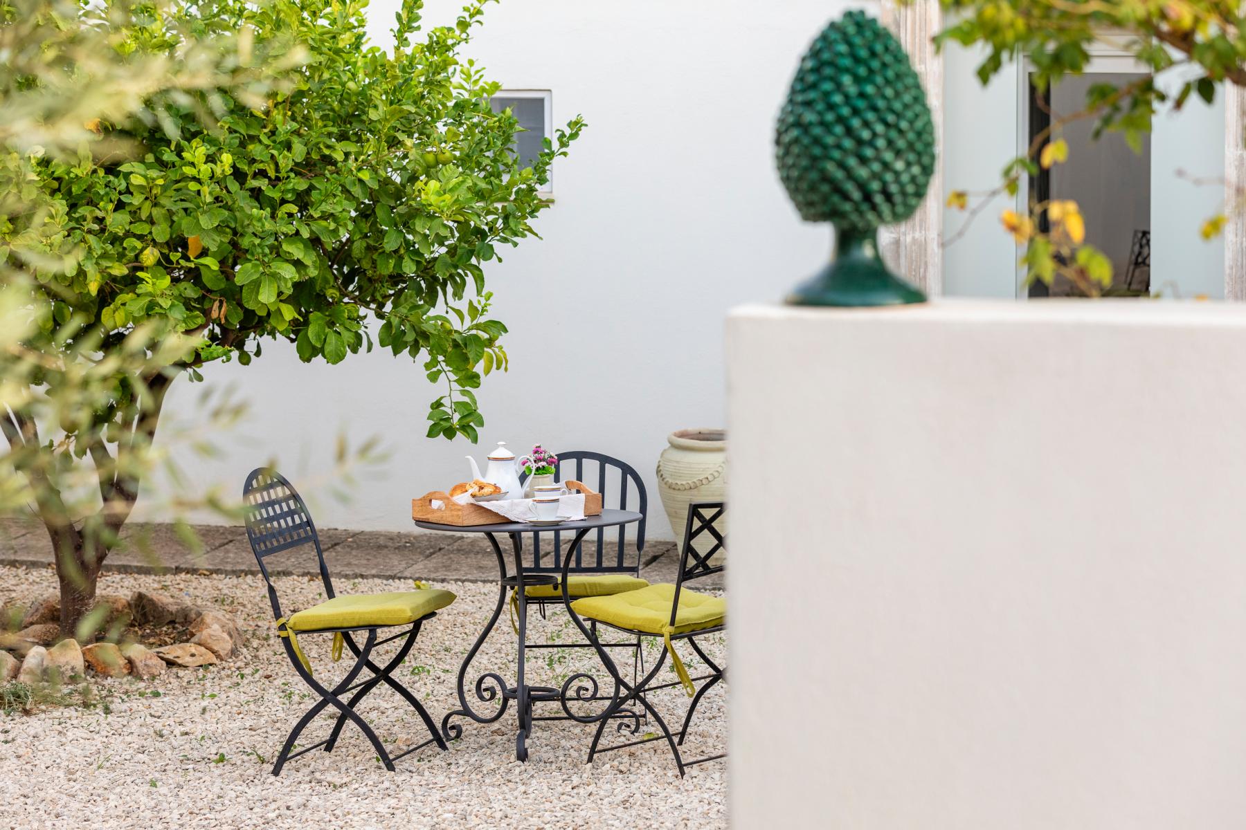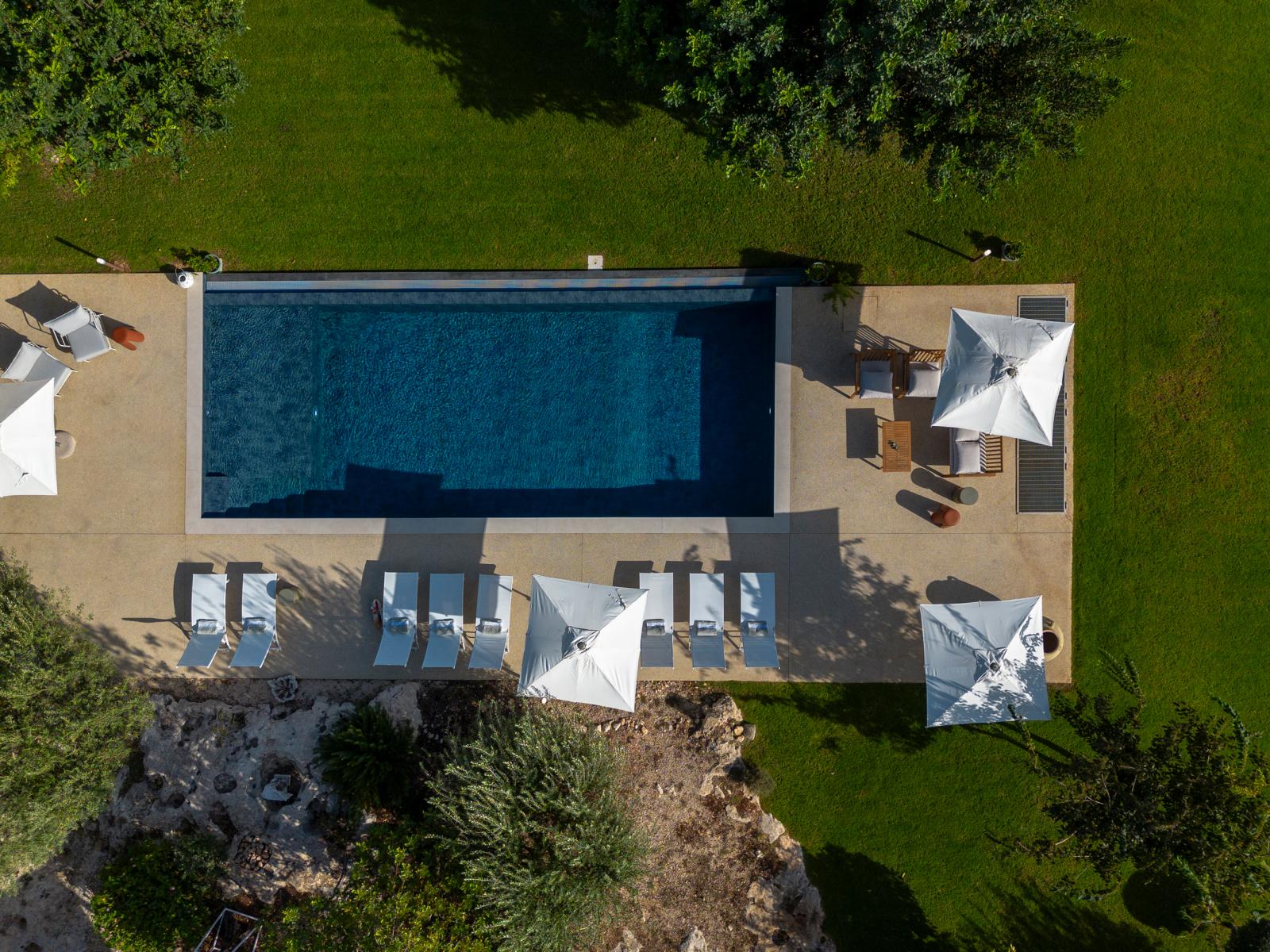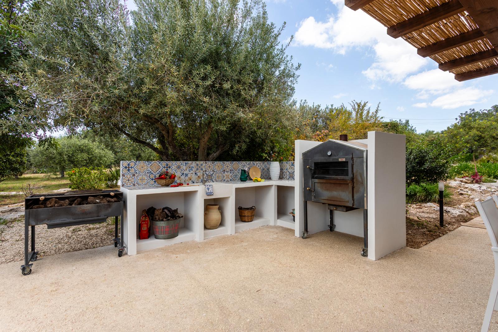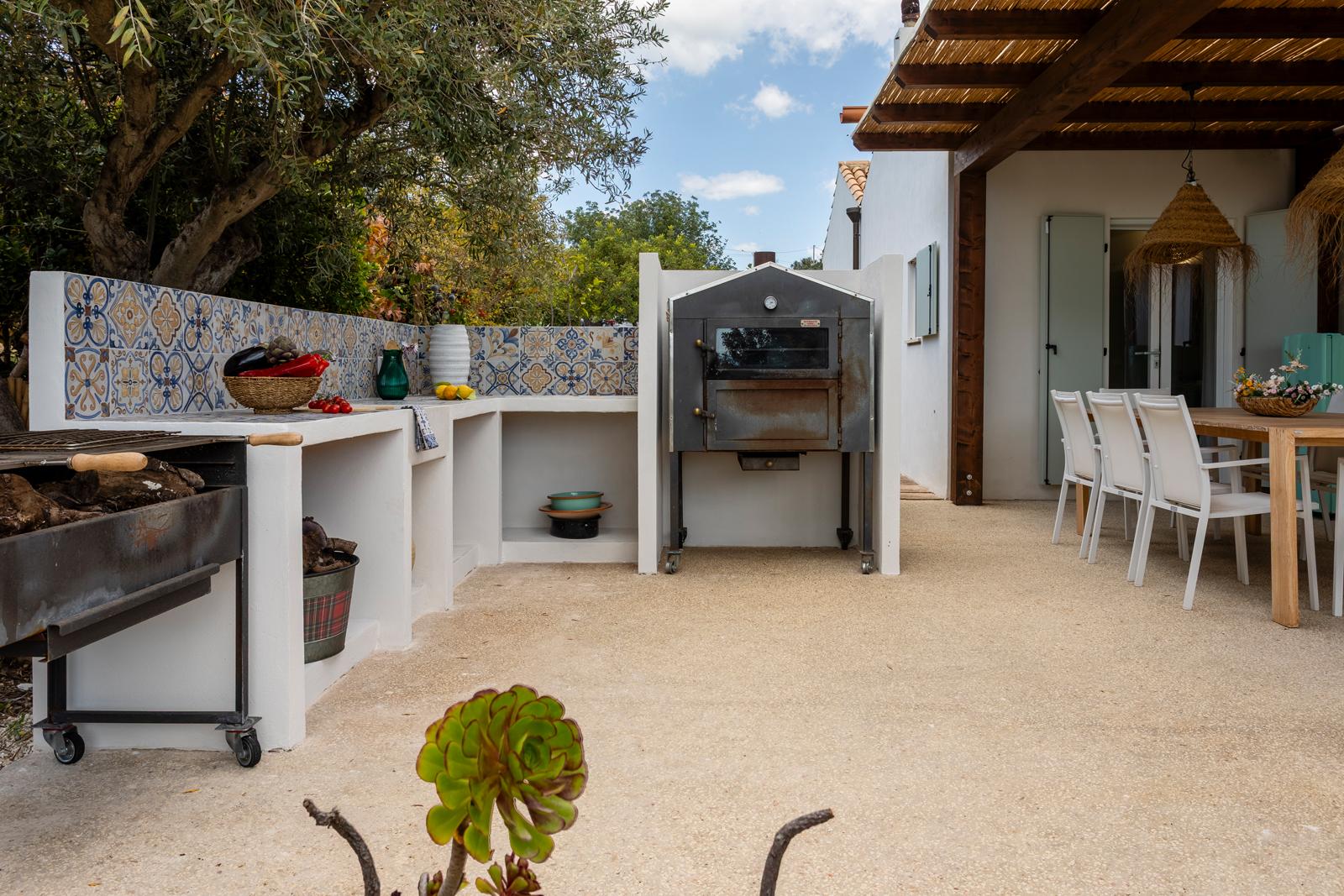 La villa si affaccia su un incantevole giardino con una splendida piscina, una jacuzzi e alberi di ulivo e agrumi. L'esterno è arredato con lettini prendisole e ombrelloni, mentre una zona pranzo esterna, direttamente collegata alla cucina, offre viste sul giardino, sulla piscina e sul mare in lontananza.