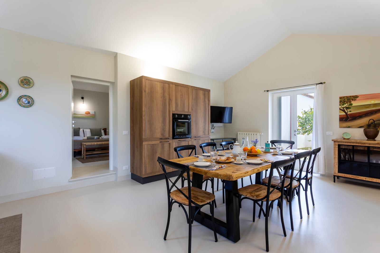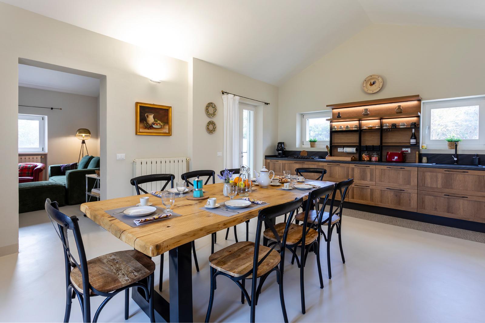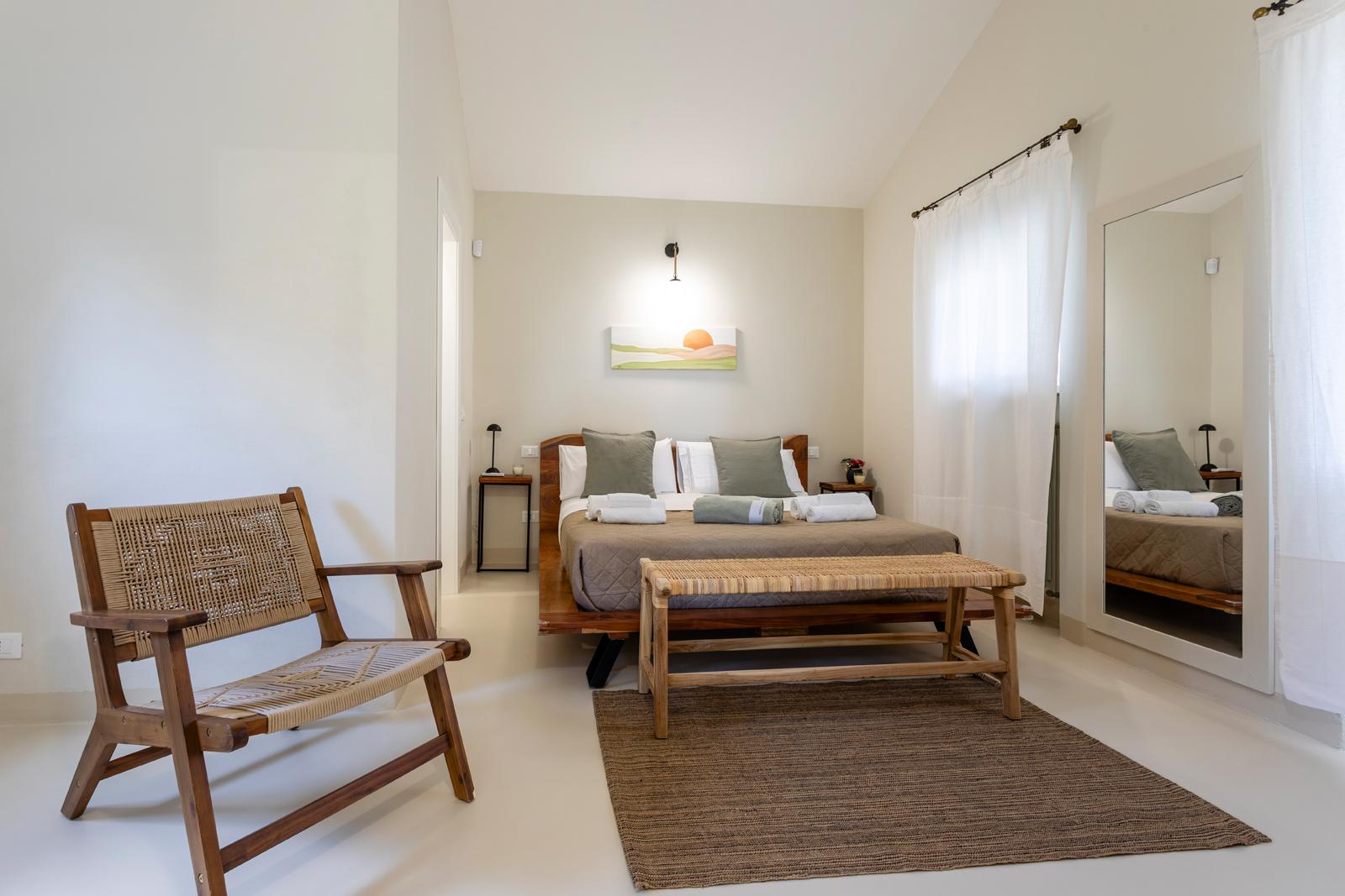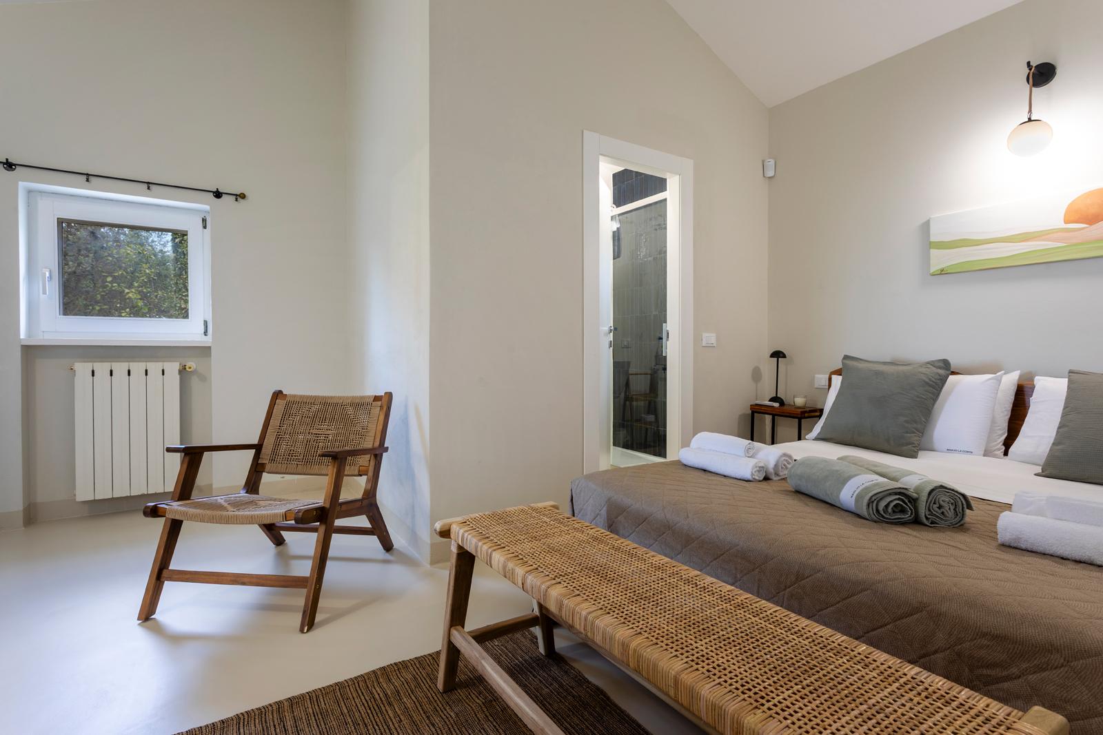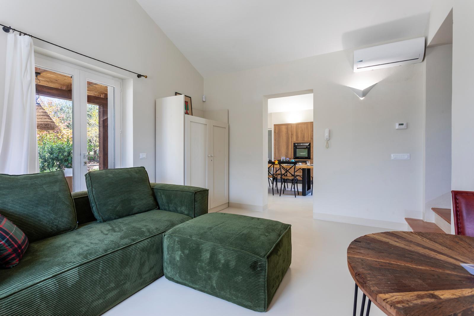Nell'edificio principale, oltre alla luminosa cucina e al soggiorno, ci sono 3 camere matrimoniali, tutte con bagno privato, 2 delle quali con un divano letto aggiuntivo. Due camere da letto sono al piano terra mentre una è al primo piano. La dependance ha un ingresso su un piccolo soggiorno con angolo cottura e divano letto, mentre una scala in legno conduce al soppalco, con un letto matrimoniale e un letto singolo. La dependance ha anche un bagno privato. Considerando i posti aggiuntivi, la villa può ospitare fino a 12 persone.