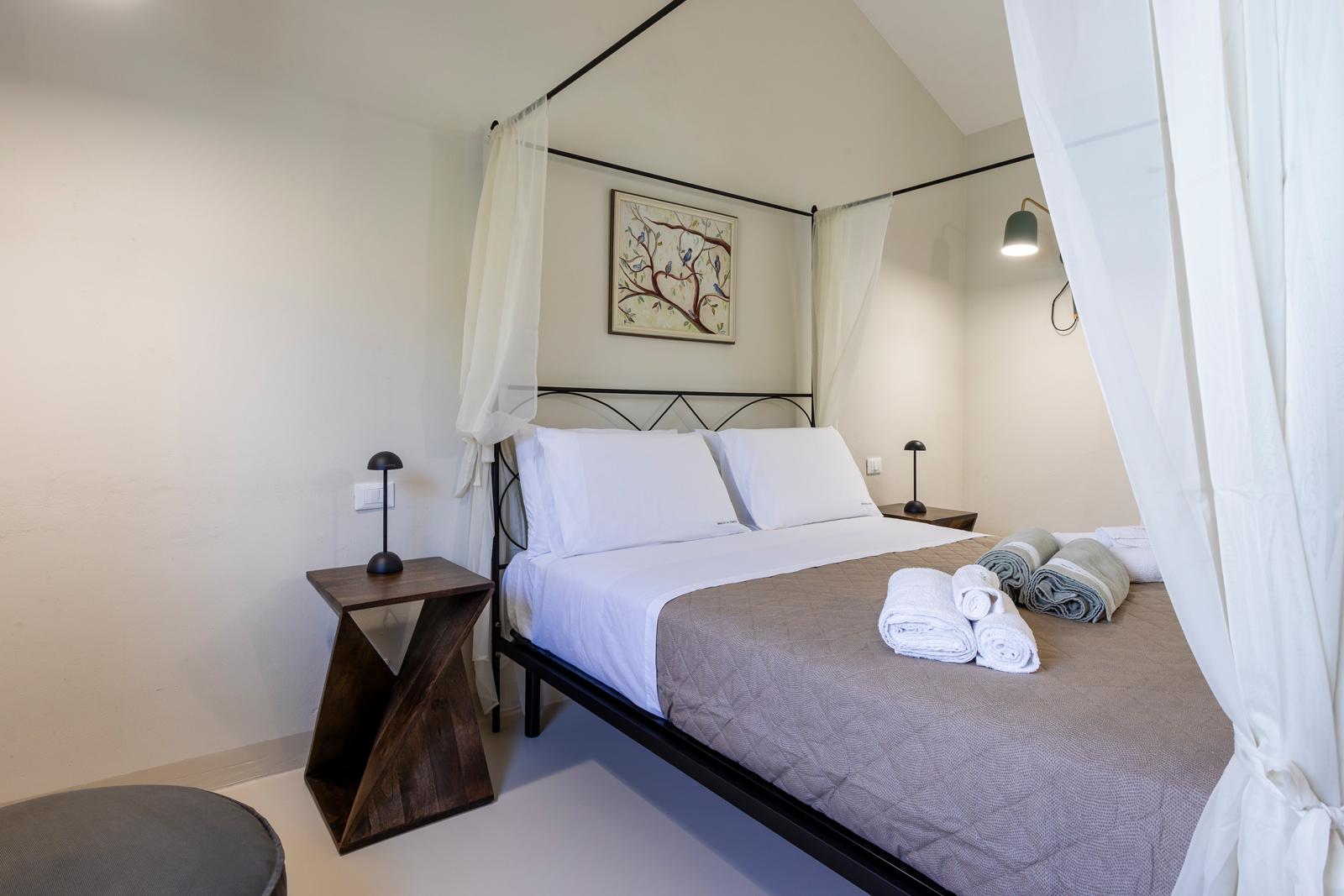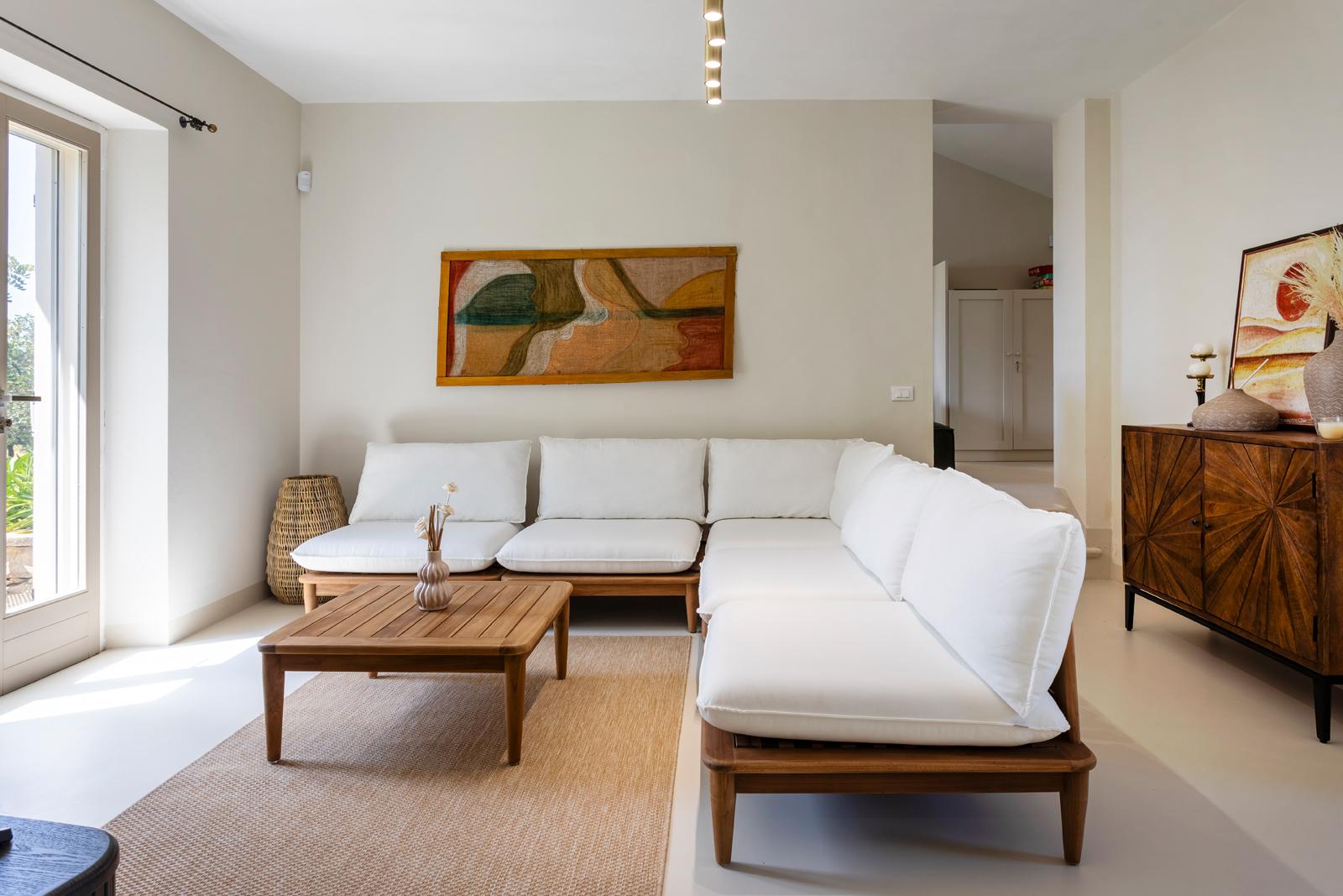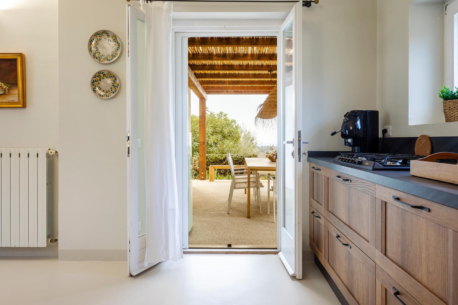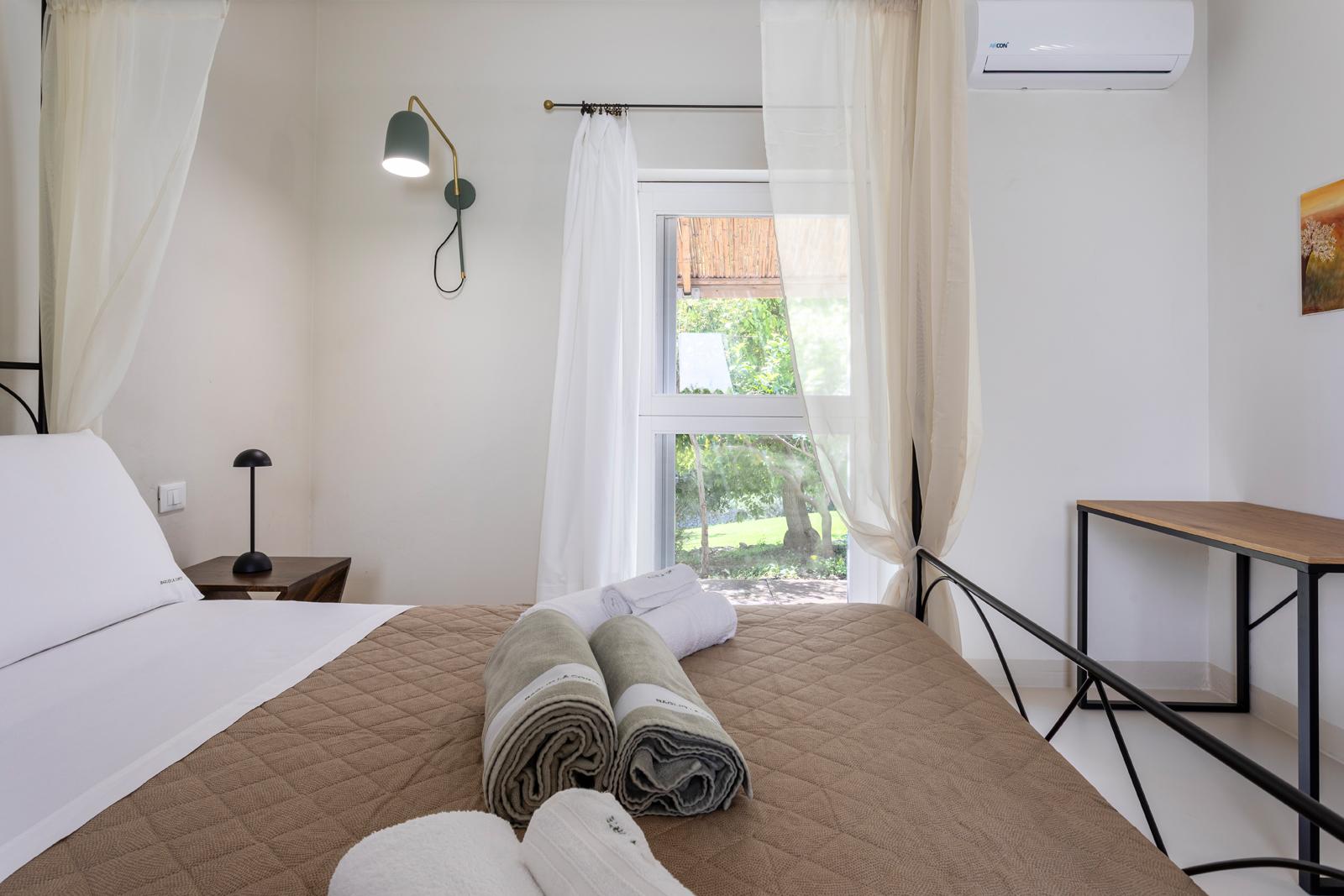 Nell'edificio principale, oltre alla luminosa cucina e al soggiorno, ci sono 3 camere matrimoniali, tutte con bagno privato, 2 delle quali con un divano letto aggiuntivo. Due camere da letto sono al piano terra mentre una è al primo piano. La dependance ha un ingresso su un piccolo soggiorno con angolo cottura e divano letto, mentre una scala in legno conduce al soppalco, con un letto matrimoniale e un letto singolo. La dependance ha anche un bagno privato. Considerando i posti aggiuntivi, la villa può ospitare fino a 12 persone.