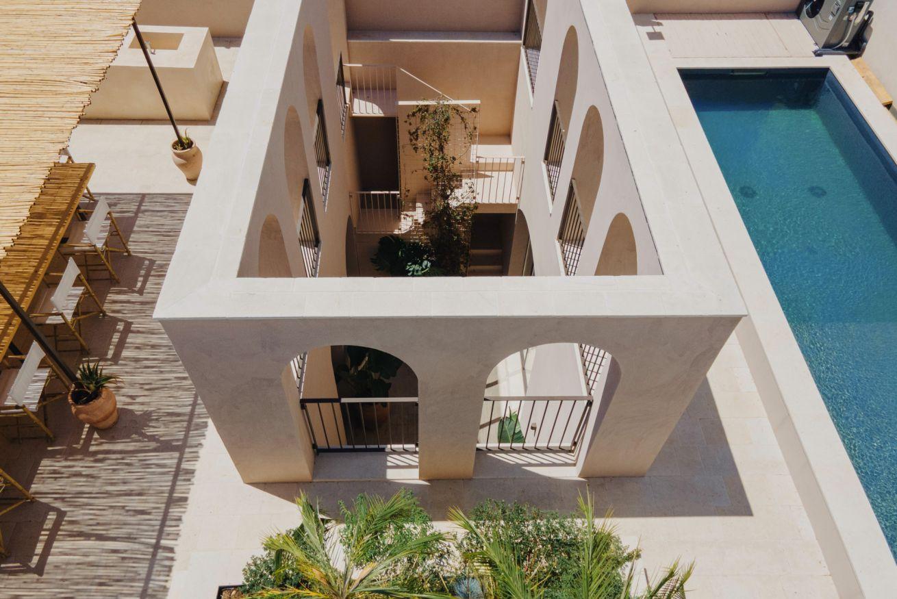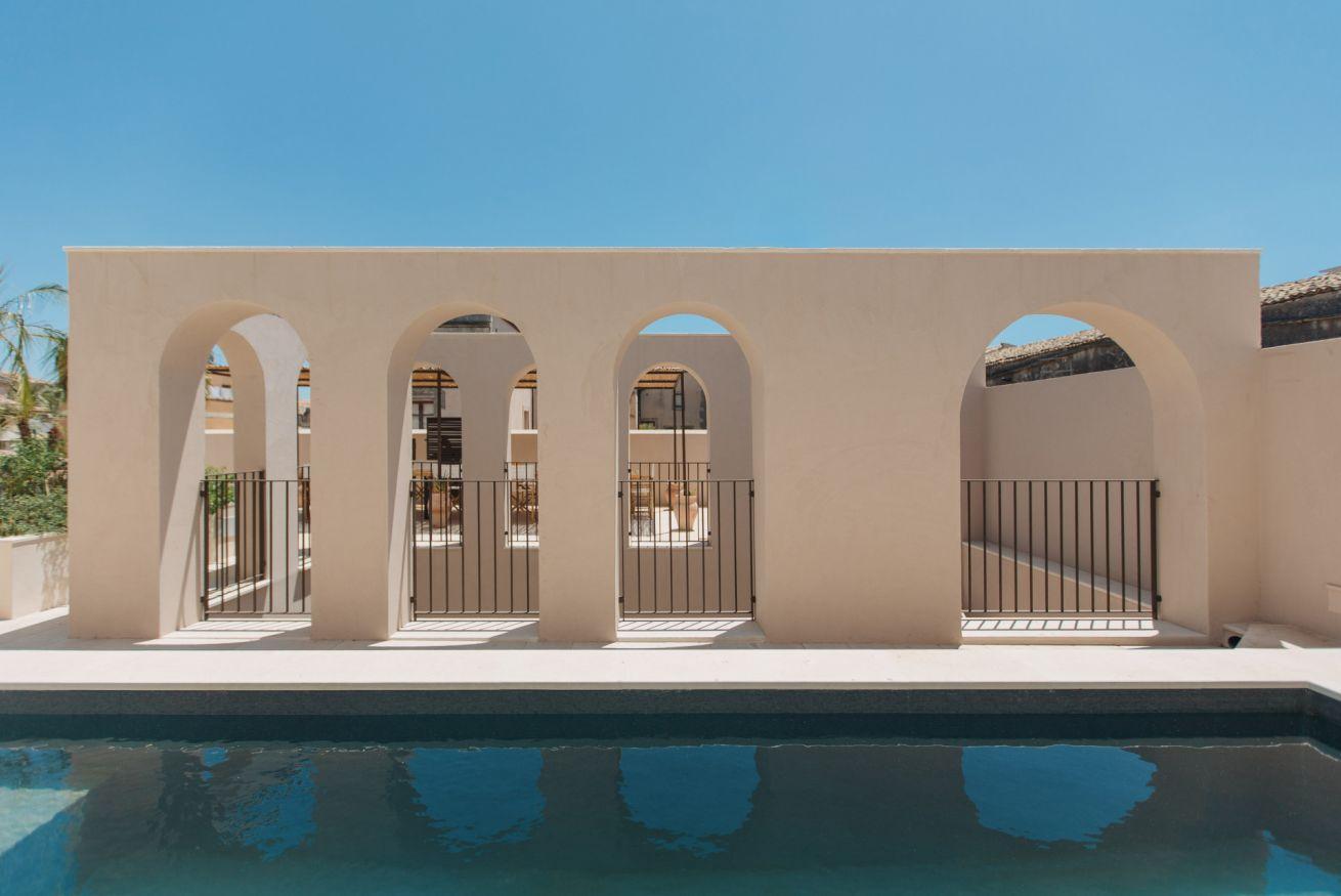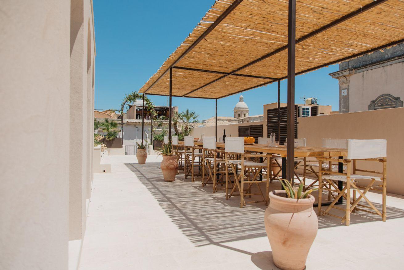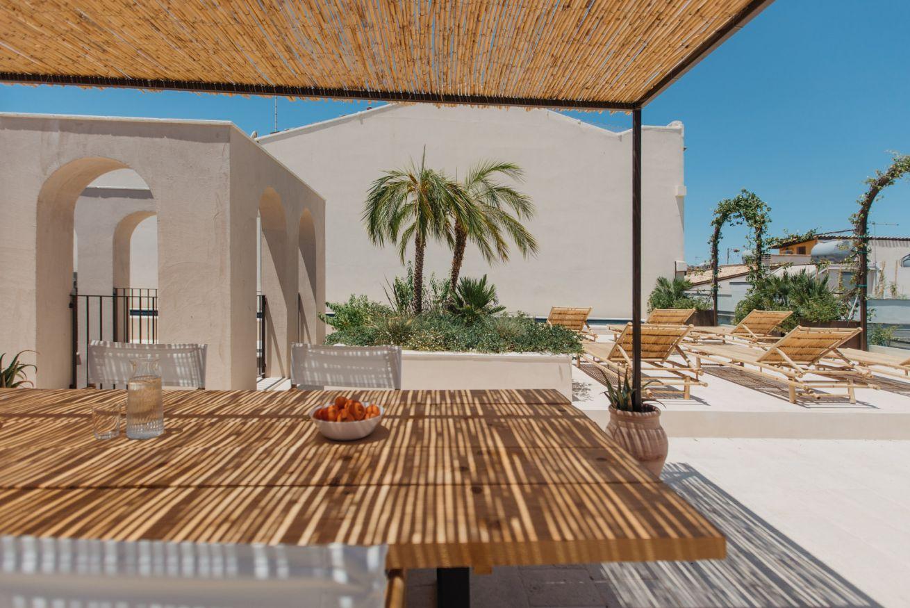 Il rooftop della palazzina liberty è un angolo di paradiso sospeso tra cielo e pietra. accoglie gli ospiti con una piscina cristallina, lettini in bambo per il sole siciliano, e una zona pranzo ombreggiata sotto una pergola elegante.