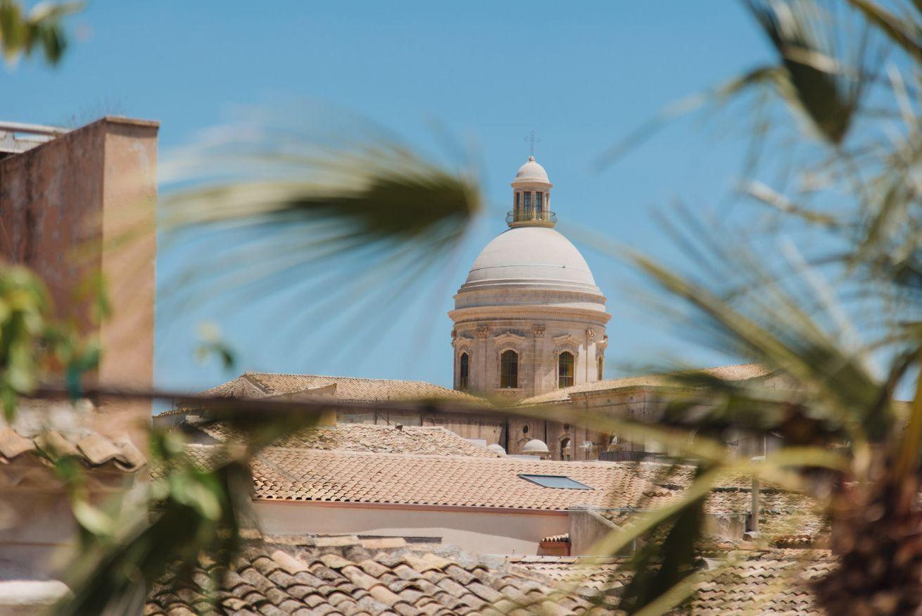 Il giardino mediterraneo, con palme e piante rigogliose, incornicia la vista sulla Chiesa del Crocifisso e sui tetti antichi di Noto. Un luogo dove il tempo rallenta e ogni dettaglio invita al benessere.