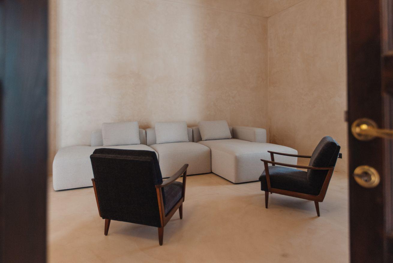 Il living è un ambiente luminoso e raffinato dove il design incontra la quiete, si apre con un elegante tavolo in vetro circondato da sedute moderne, mentre una poltrona in vimini di Bonacina accanto all’arco richiama il fascino mediterraneo.